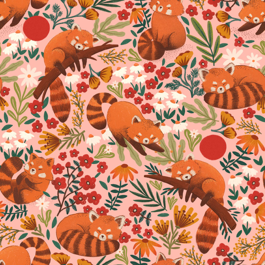 Pattern: Pastel pink with sleepy red pandas and floral print, orange and purple contrast stripes and red trim