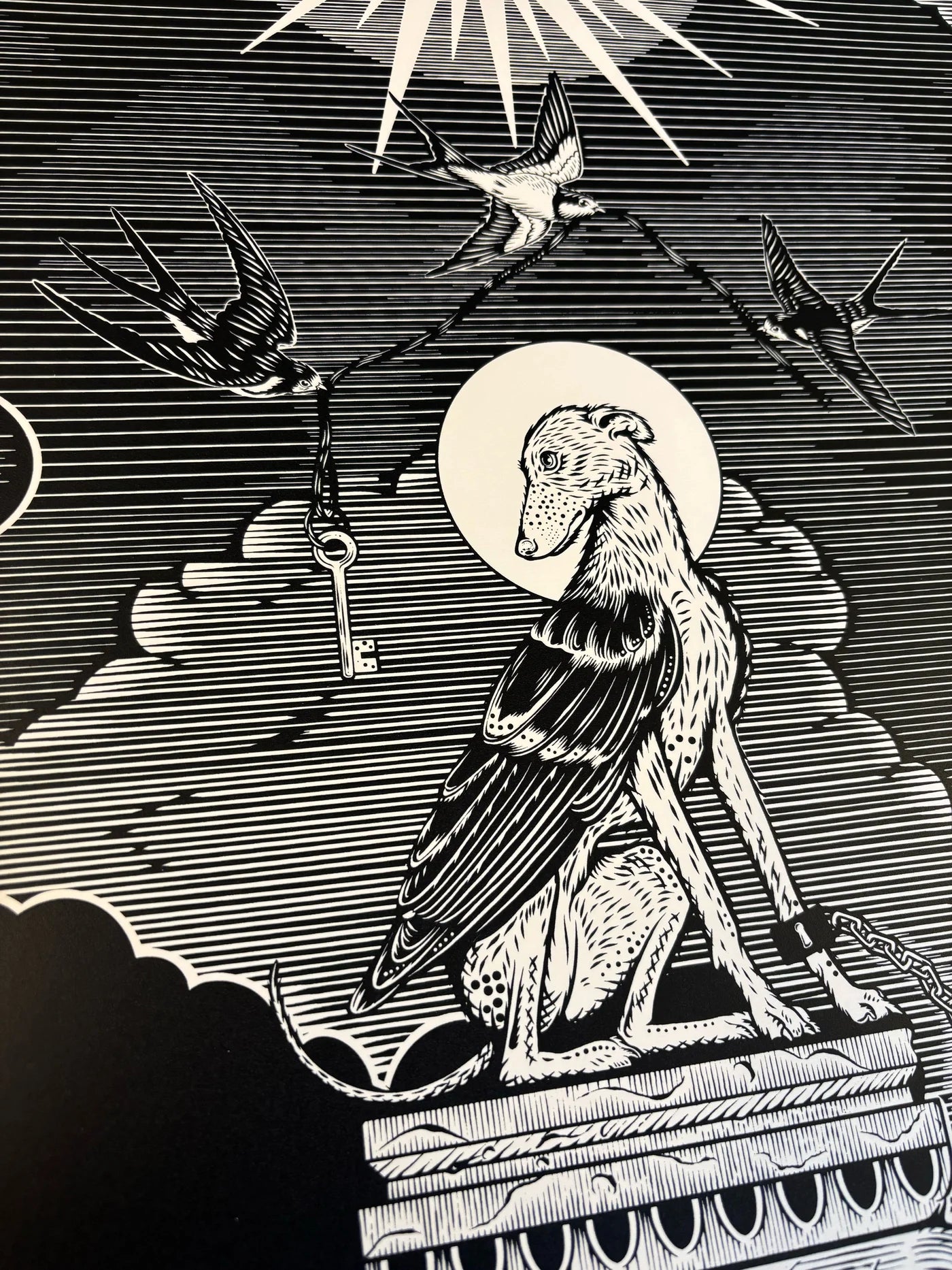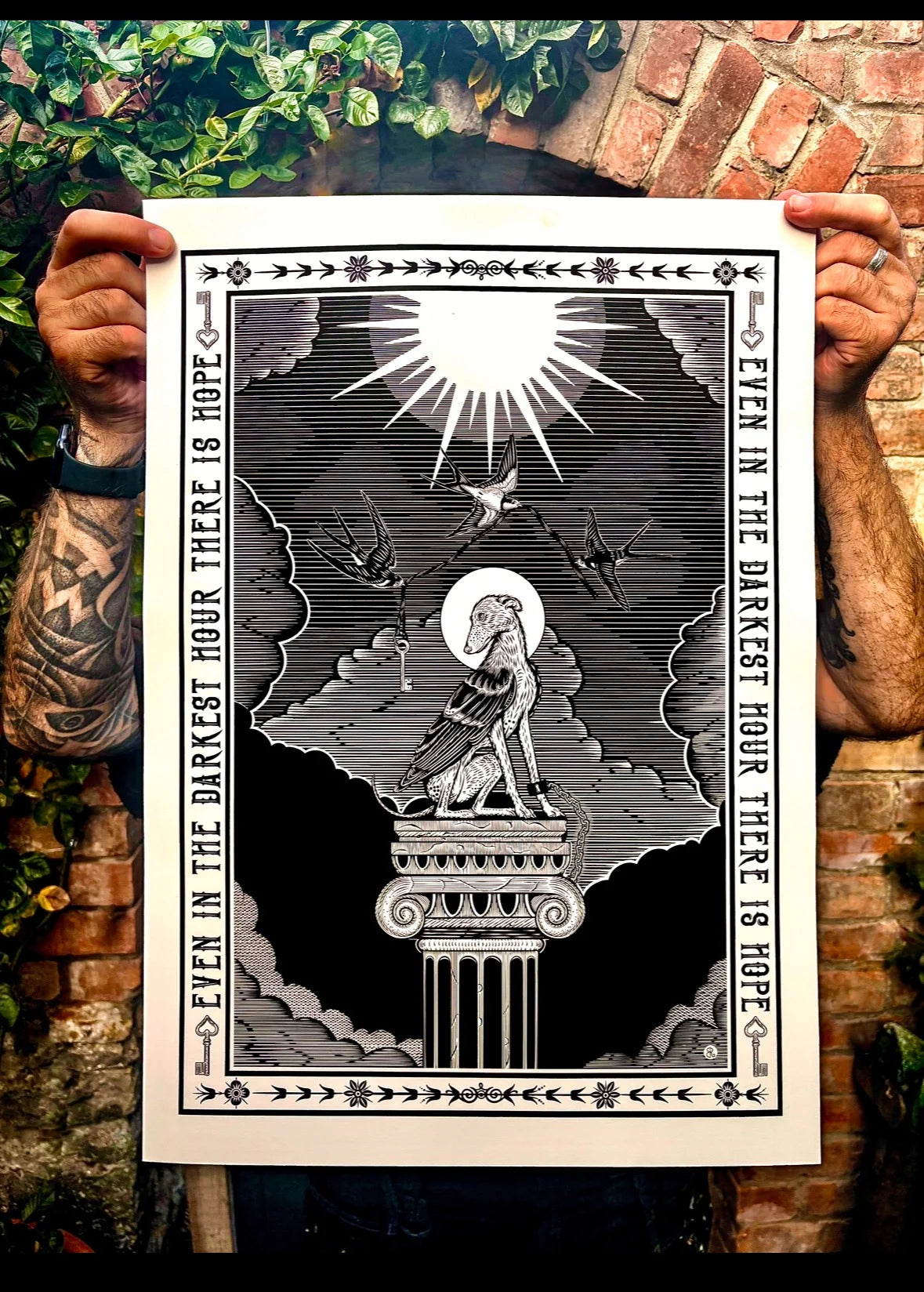 Exclusive black and white limited edition screen print of "Even in the darkest hour there is hope". Each print is signed and numbered by the artist.