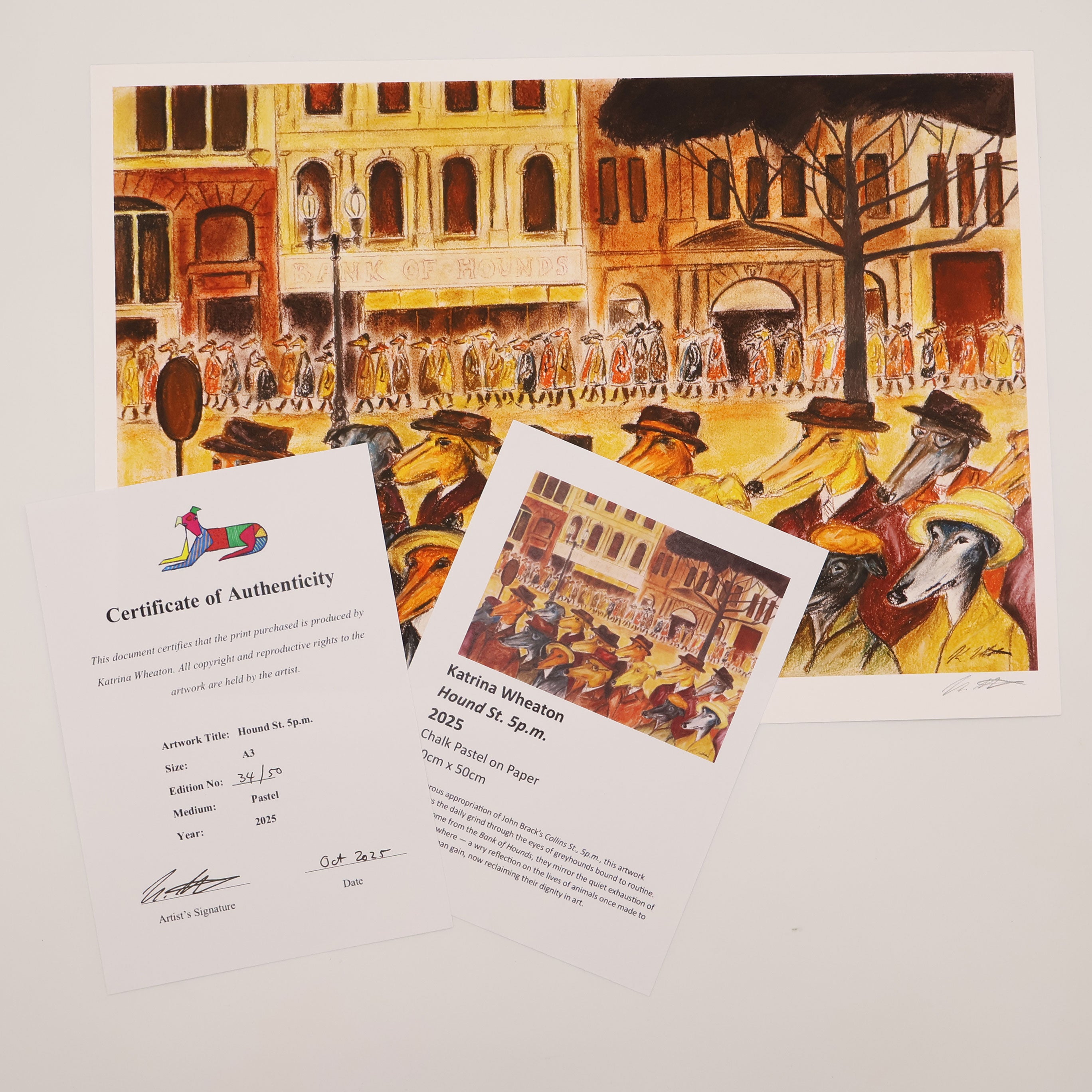 Exclusive colourful limited edition print based on John Brack's Collins St, 5pm (1955) "Hounds at 5pm". Each print is signed and numbered by the artist.