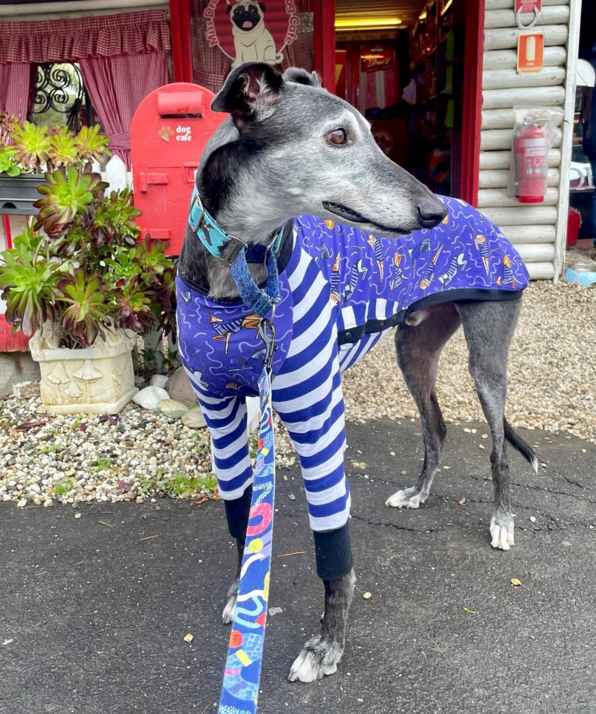 If your dog is new to clothing, start simple. A Sleeveless Tee has the least fabric and is the easiest to pop on and off. Many new hounds are unsure about having their paws handled, so Long Sleeves may be better once they feel settled and safe.