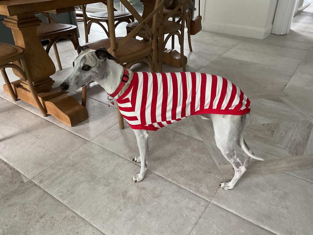 Measure your hound around their chest under the front legs. Do this snugly as this is a fitted garment and will stretch to fit your hound neatly.