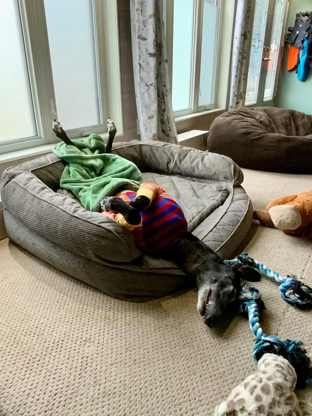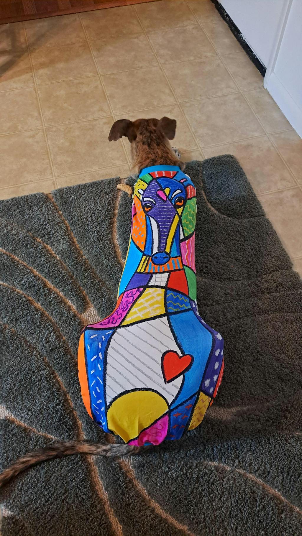 Second. This is the first thing we got since her amputation. The simplicity and accuracy of ordering this altered for her literally made me cry. Who would've thought accessibility for dogs matters?? It felt like a HUG. Then it arrived. Absolutely gorgeous print exactly as picture down to the colors. And the alteration? Omggg. How did they nail it!? Magic. This company is magic for your magic familiar. Highly highly recommend. If I won the lottery I'd literally by every size and pattern for all future sighthounds.