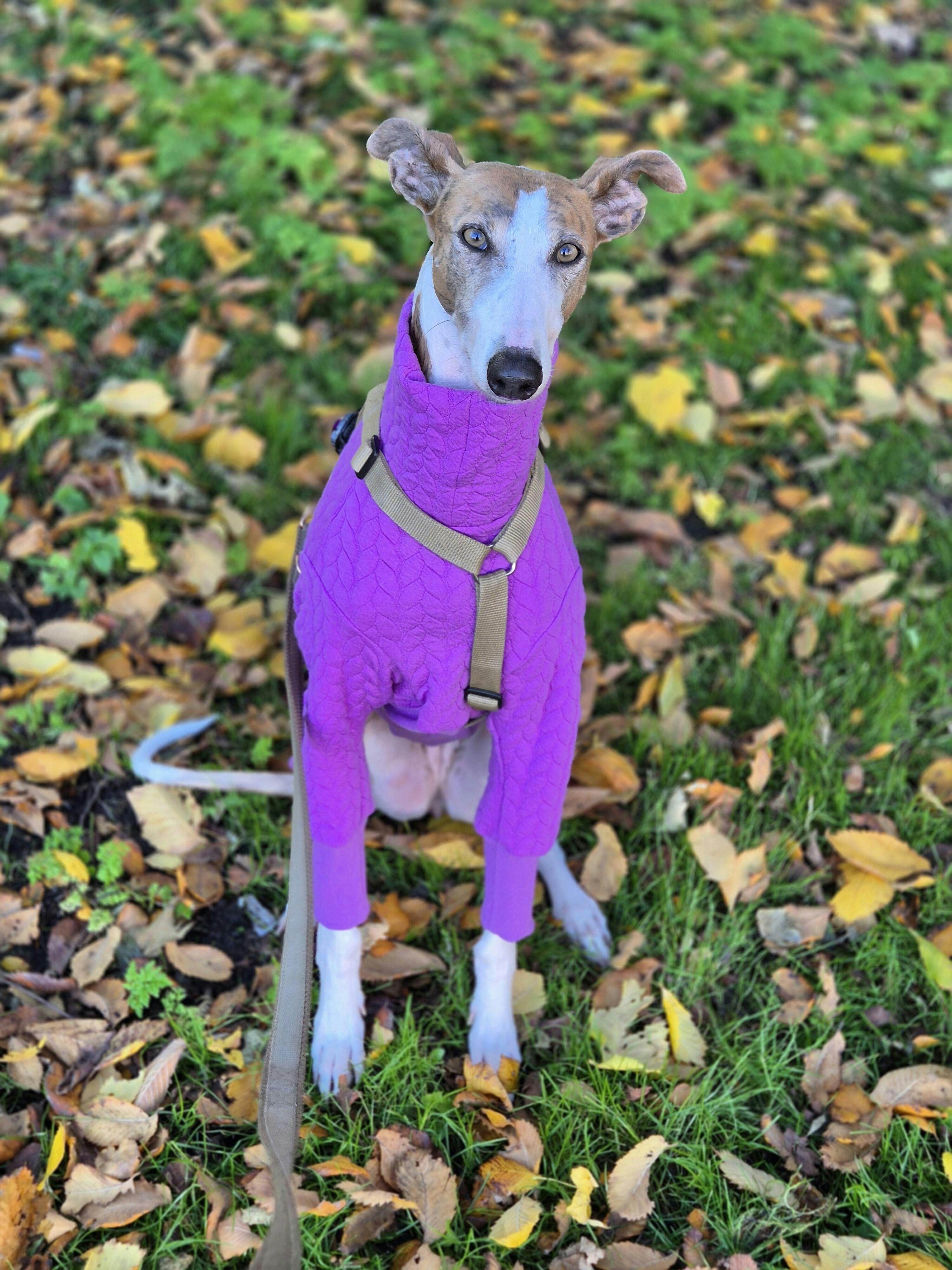Whippet L is a perfect fit on our petite (17kg) galgo female. And the little sleeves are heart-melting.