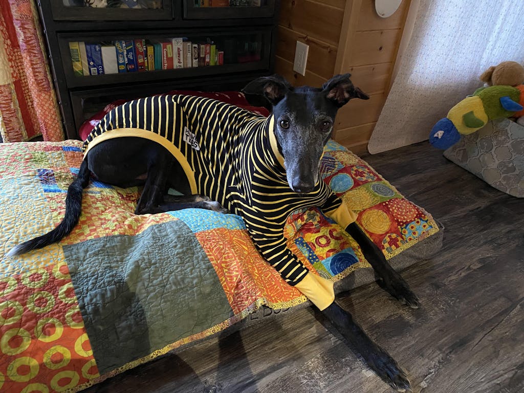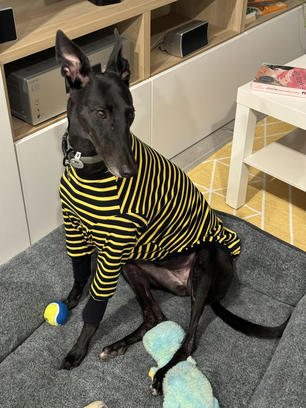 If you're cold, your doggo won't be too far behind. Sighthound's bods do run at a higher base temp than hoomans, so they should typically feel warm to your touch.