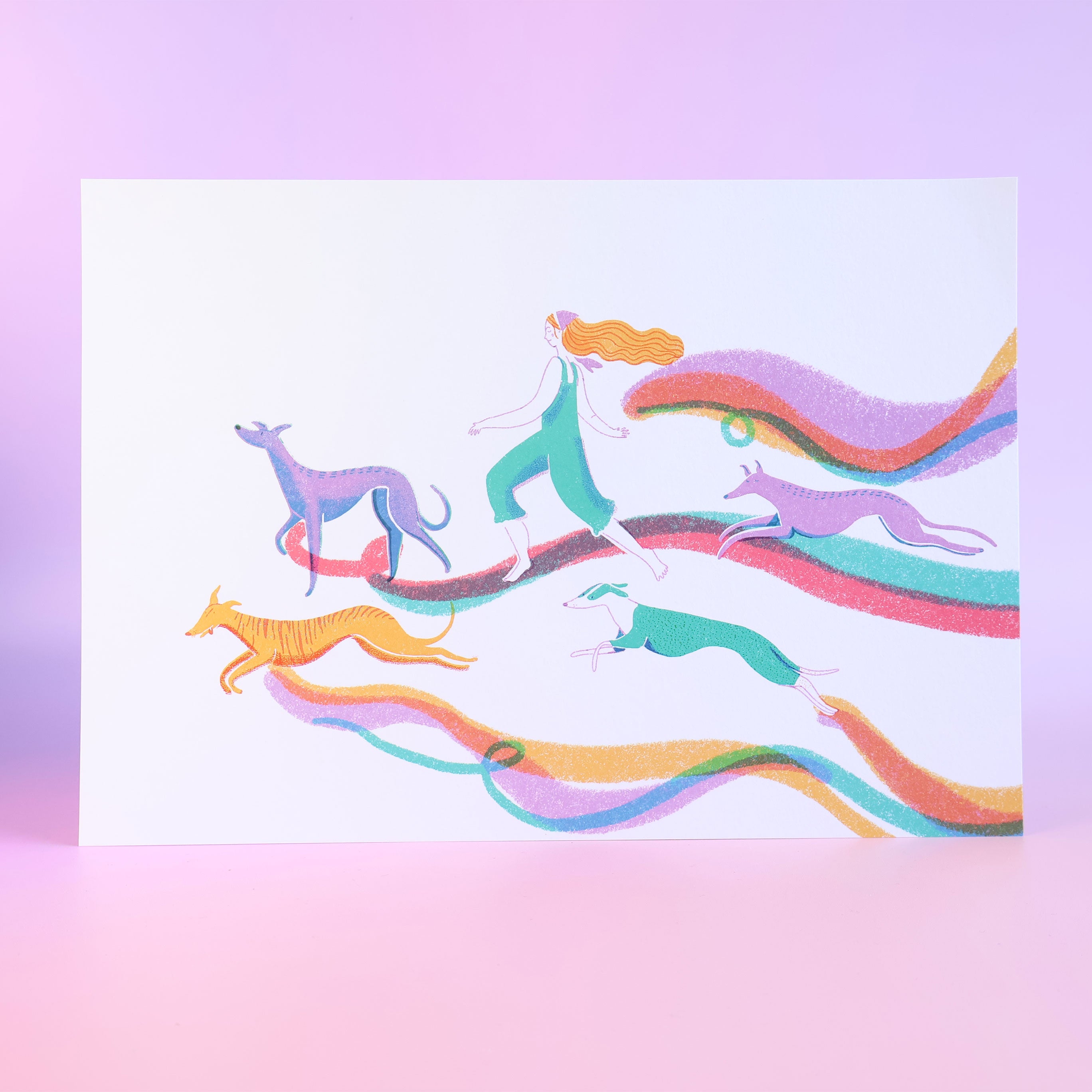 A positive and colourful illustrated print of a girl running through rainbow colours with rainbow hounds. Art print of ‘Dream Hounds’ mixed media illustration