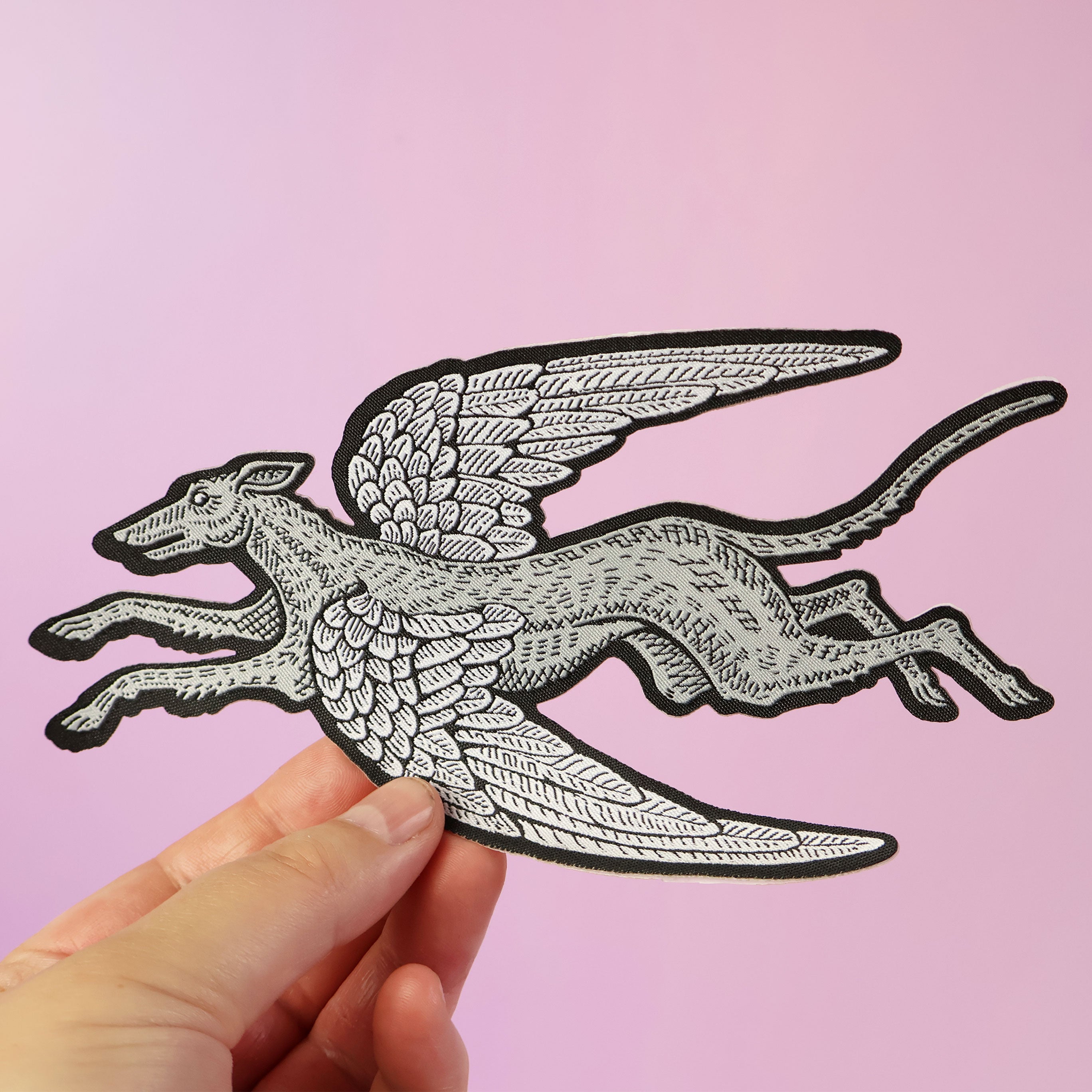 This is an iron on woven fabric patch of a happy flying sighthound With silver wings and grey body.