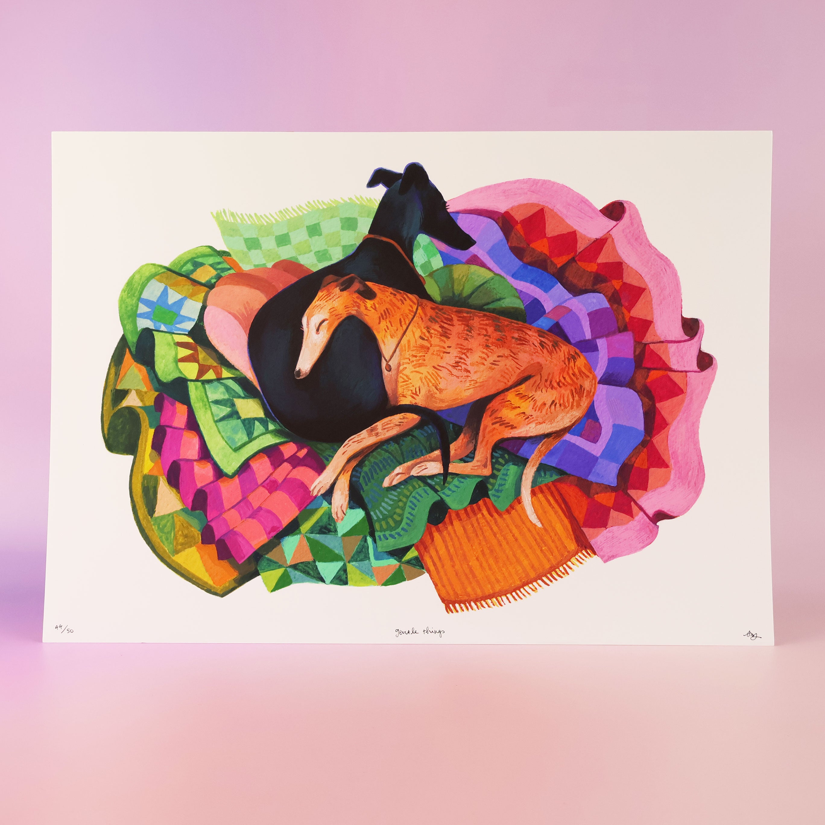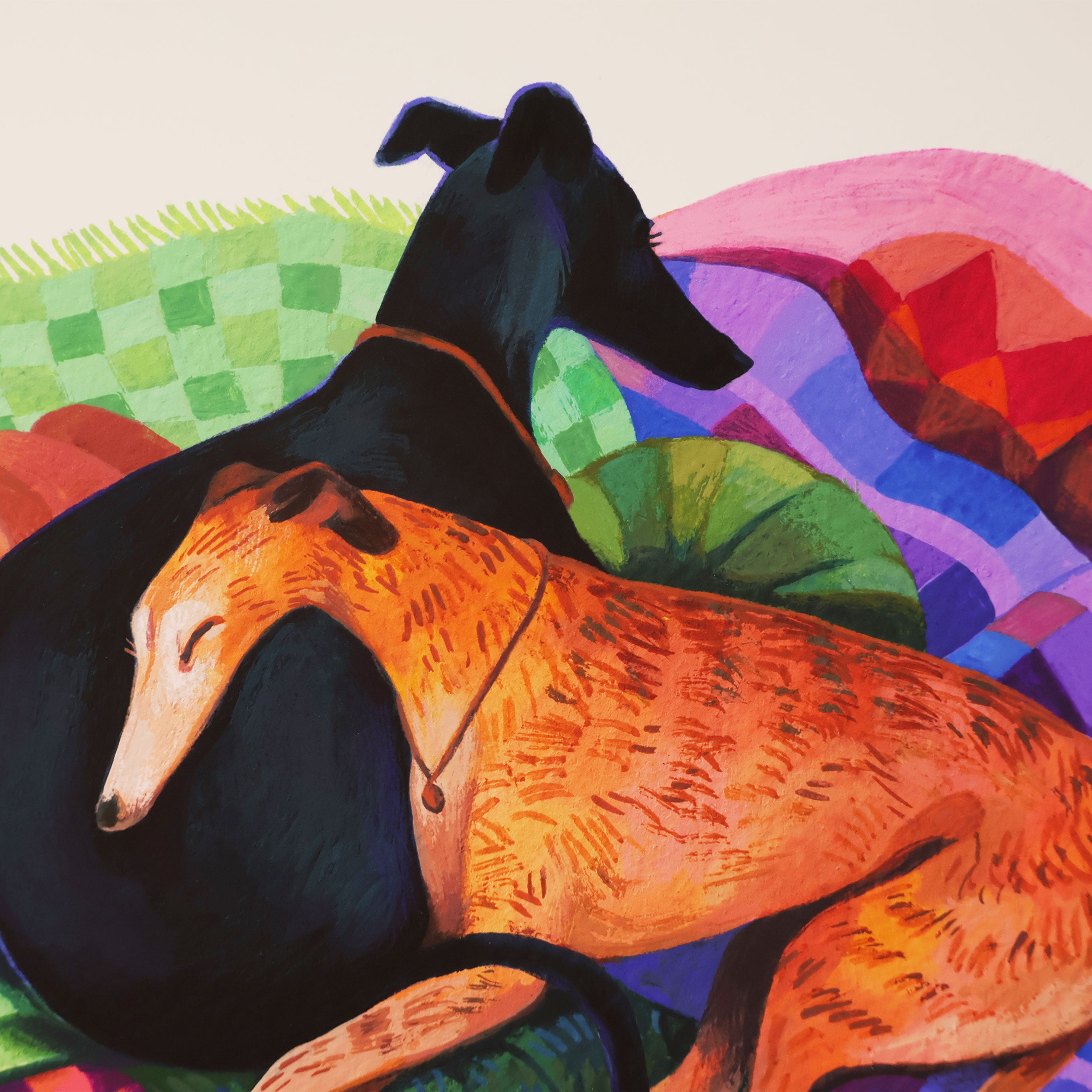 Exclusive colourful limited edition print of Sophie's hounds "Bebe & Pia". Each print is signed and numbered by the artist.