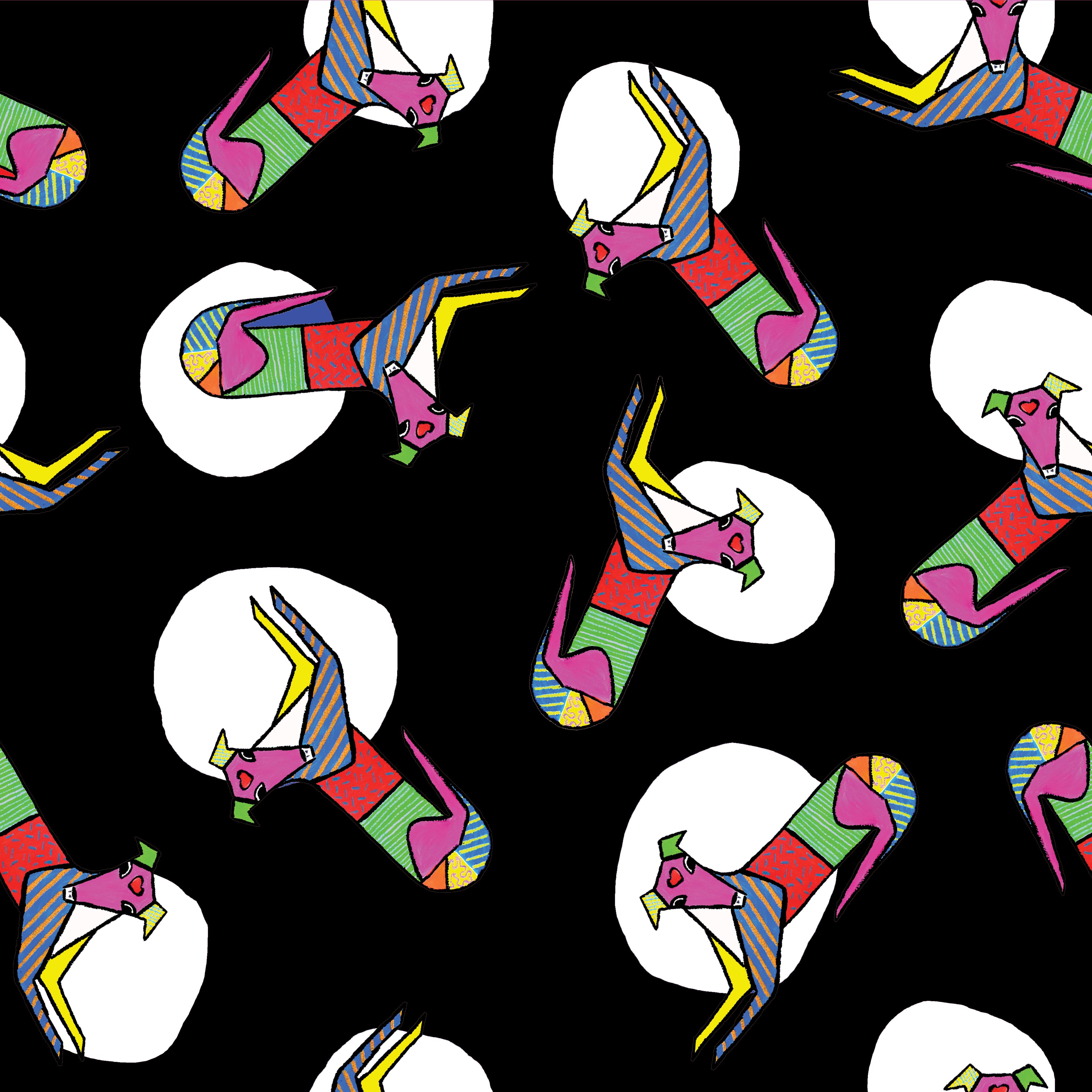 Pattern: Hand drawn bright colour patchwork dog on black and white spot with contrast black and white spot and red trim