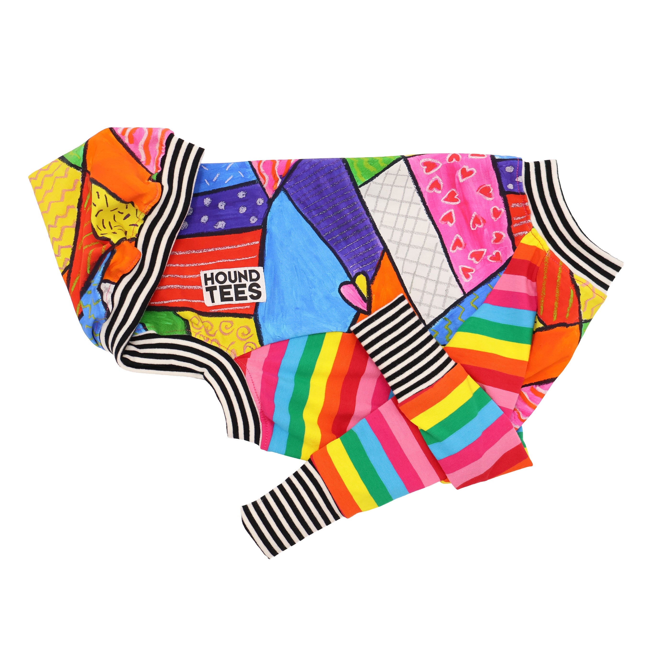 Pattern: Hand drawn bright colour patchwork print with contrast rainbow stripe and black and white strip trim
